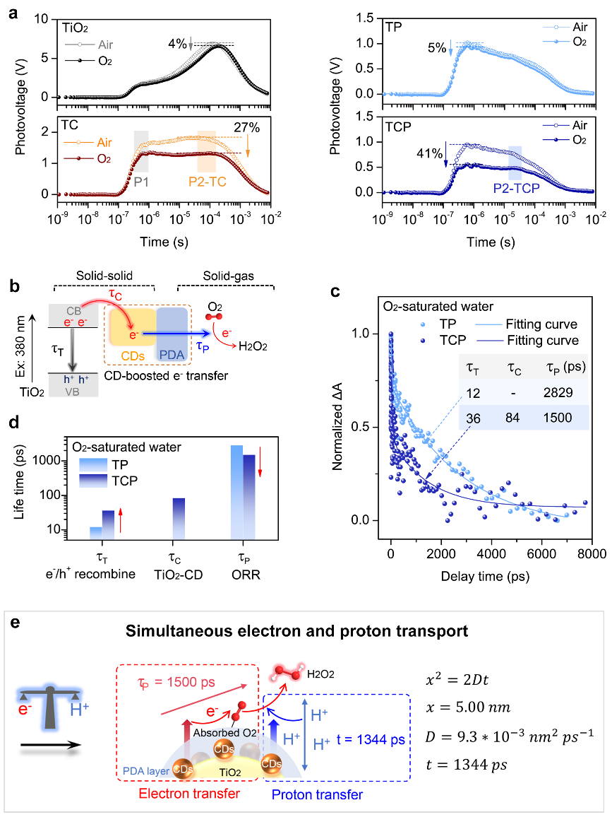 图2. (a)原位瞬态光电压光谱测试得到的催化剂表面光生电子的利用效率。(b- e)TCP复合催化剂中光生电子与质子传输动力学的匹配。
