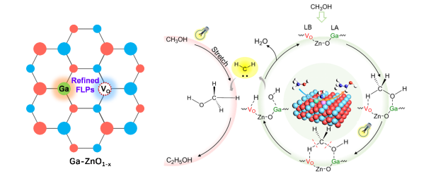 李路教授和加拿大麦吉尔大学李朝军院士团队设计制备了一种含有丰富受阻路易斯酸碱位点(frustrated Lewis pair,FLP)的Ga-ZnO1-x半导体光催化剂,首次在可见光照射下实现甲醇经由卡宾路径高选择性制备乙醇。动力学同位素效应、酸碱位点阻断、原位光谱等一系列机理研究结合理论计算表明,由氧空穴和Ga原子构成的FLP位点能够分别激活甲醇的C-H和C-O键,同时有效捕获光生电子和空穴,协同促进了亚甲基卡宾中间体的形成。产生的卡宾中间体随后插入另一个甲醇分子C-H键生成乙醇。研究还发现,Ga-ZnO₁₋ₓ催化剂在可见光照射下的乙醇选择性显著提高,从紫外光下的67%提升至97%,表明其在温和条件下有效抑制了副反应的发生。
