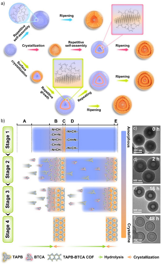 冯威教授、中科院过程工程研究所王丹研究员合作,在中空多壳共价有机框架材料(ns-COF HoMSs)的合成策略方向取得重要进展。基于COF的多壳结构难以构建这一关键科学问题,该团队创新性地采用了一种“晶度波”诱导的区域差异成熟策略,合成了一系列具有可控壳数和壳厚度的空心多壳COF颗粒。该方法通过短时间的Ostwald熟化过程,在两层非晶的共价有机聚合物(COP)之间插入一层晶态共价有机框架(COF)薄层。这层局部结晶的界面可以在后续的完全熟化过程中起到隔离作用,使前驱体颗粒的不同区域呈现出差异化的反应进程,最终形成具有中空多壳层结构的特殊形貌。研究成果以“Crystallinity Wave”-Driven Synthesis of Hollow Multi-Shell Covalent Organic Frameworks for Enhanced Supercapacitors为题,于3月23号发表在Angewandte Chemie International Edition上。
