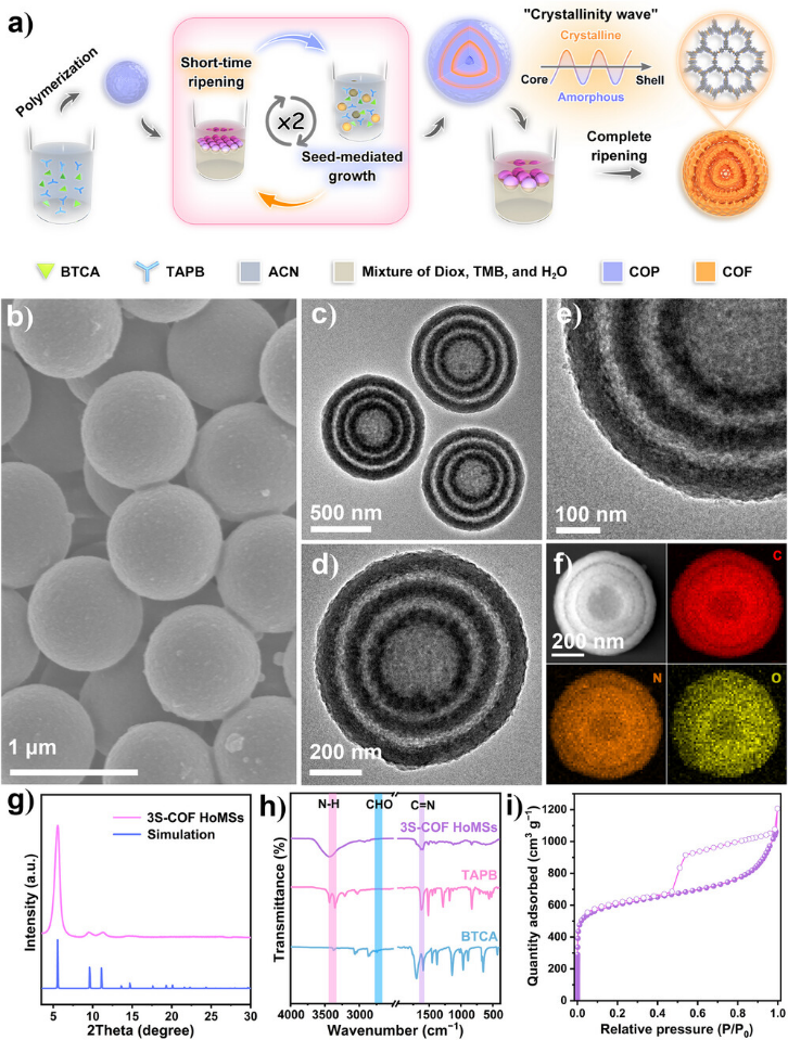 制备出的具有中空三壳结构的共价有机框架材料(3S-COF HoMSs)展现出优异的结晶度与超高比表面积(高达2137.6 m²/g),材料呈现均匀球形形貌,平均粒径约800 nm,壳层厚度约70 nm。团队成员创新性地在COP层间插入COF薄层,形成具有"结晶度波"的前驱体。在后续的动态亚胺交换反应中,由于COF层稳定性远高于COP层,且COF层两侧的COP层也因预处理而存在稳定性差异,内部COP单体优先水解迁移至低表面能区域结晶,形成稳定的多层COF结构。