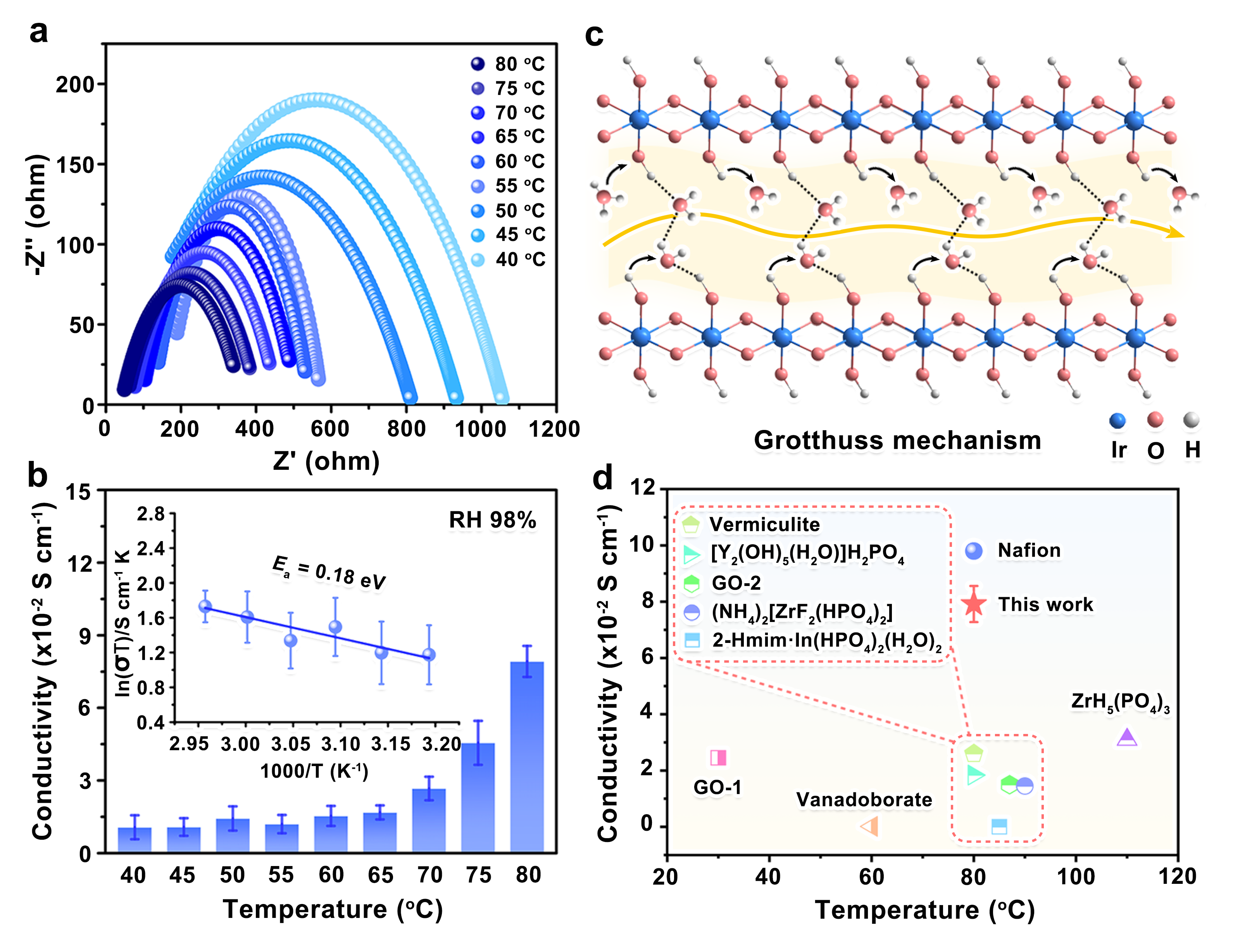 层状铱基氧化物在质子交换过程中可以向结构中引入羟基,从而原位构建质子传输网络,这一特点赋予了材料潜在的质子传导能力。对缺陷氧化铱纳米片进行不同温度和湿度条件下的质子传导性能测试发现,其在80℃、95%湿度条件下的质子传导率接近商业Nafion膜(8.0×10-2S/cm),质子传输遵循Grotthuss机理(图3)。