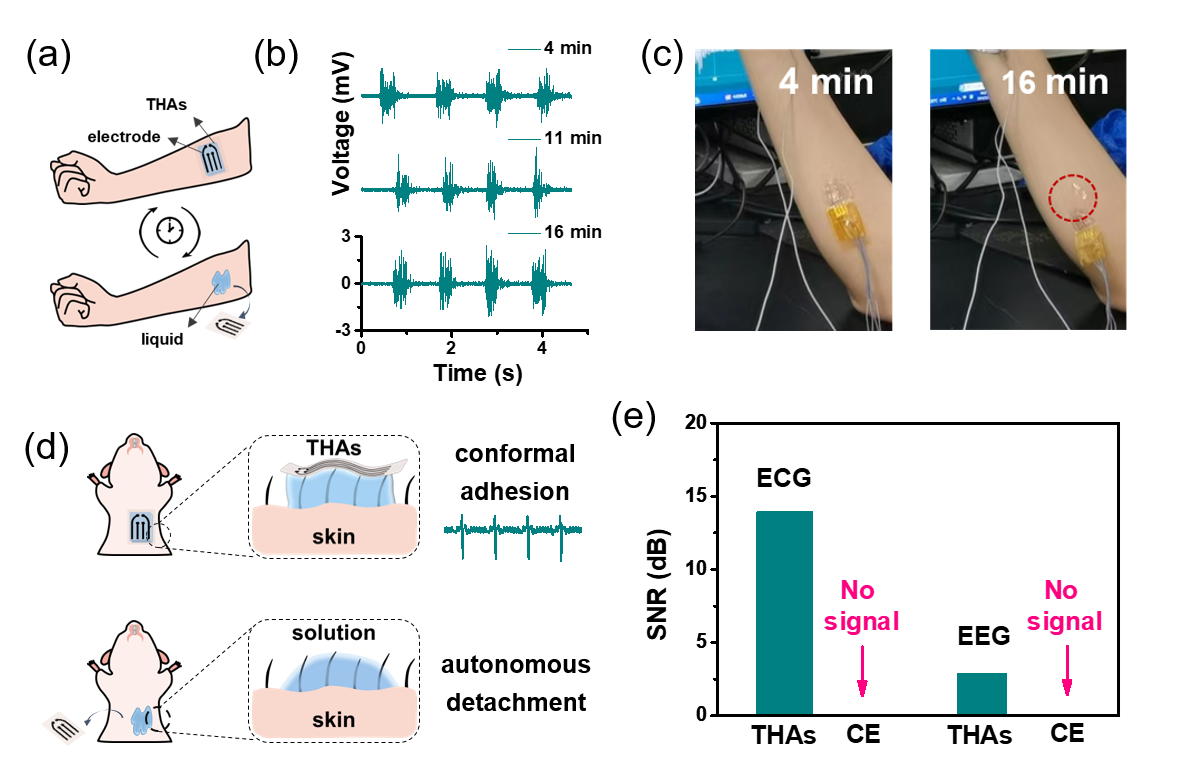 图3.(a)瞬态水凝胶粘合剂生物电子界面结合电极采集人肌电信号的示意图;(b)不同时间段采集的肌电信号;(c)自液化过程驱动电极逐渐滑落;(d)瞬态水凝胶粘合剂生物电子界面结合电极采集大鼠心电信号的示意图;(e)瞬态水凝胶粘合剂结合电极采集的大鼠心电(ECG)和脑电(EEG)信号与商用电极(CE)采集信号的信噪比(SNR)对比。