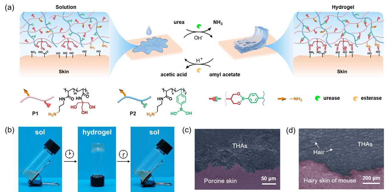图1.(a)拮抗酶反应网络驱动的瞬态自液化水凝胶粘合剂的示意图;(b)瞬态自液化水凝胶粘合剂自主的溶胶-凝胶-溶胶转换;(c)瞬态水凝胶粘合剂与猪皮表面褶皱的适形粘附扫描电子显微镜照片;(d)瞬态水凝胶粘合剂与小鼠多毛发皮肤的适形粘附扫描电子显微镜照片。