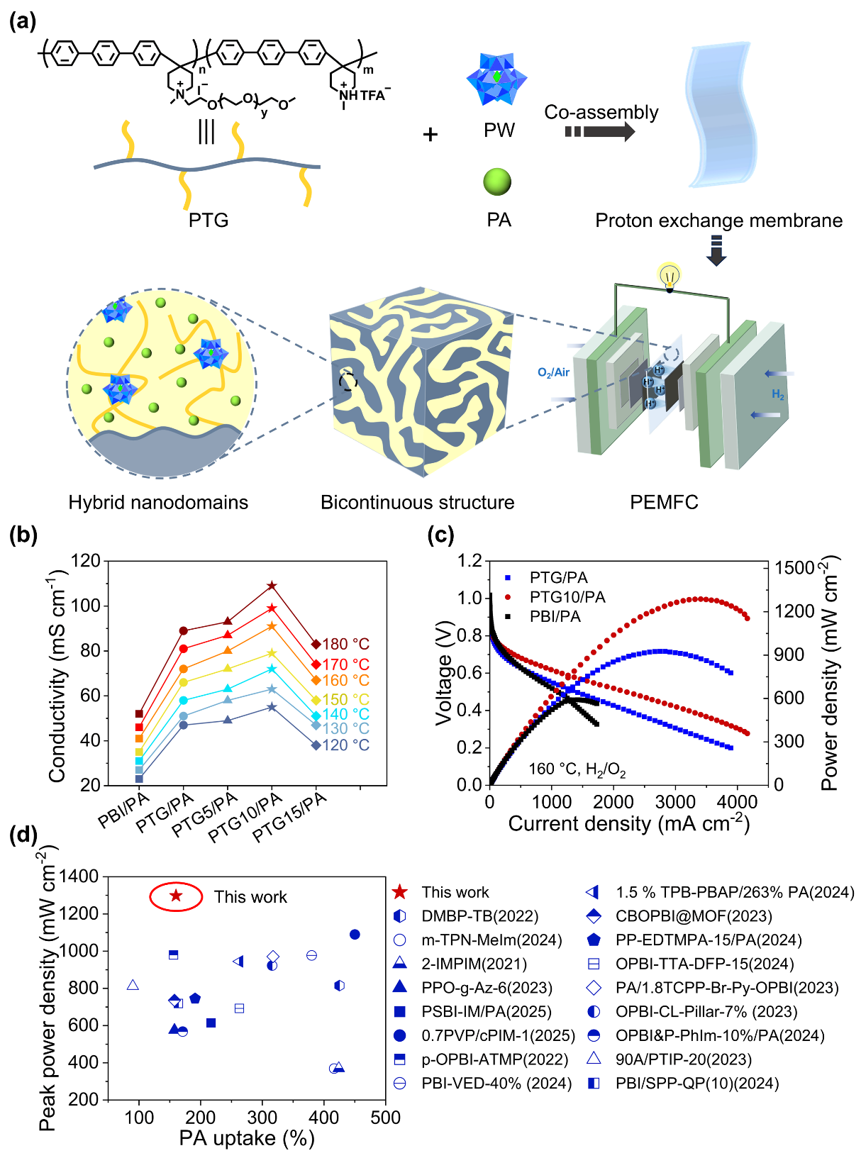 针对上述问题,李昊龙教授团队与赵成吉教授合作,提出了多金属氧簇(POMs)/聚合物杂化制备高温质子交换膜的新策略。他们通过将聚乙二醇(PEG)接枝的梳形聚合物(PTG)与H3PW12O40(PW)和PA共组装,制备了具有PW/PEG/PA三元杂化纳米离子相区的高温质子交换膜。在这些相区中,PW和PA作为质子源提供高浓度的质子,同时PW和PEG能协同促进PA的质子解离,进一步增加体系中的自由质子浓度;此外,这三组分之间可形成丰富的氢键网络,提供了高效的质子跳跃路径。基于此,所制备的高温质子交换膜在较低的PA掺杂量下(160%)依然展现出优异的质子电导率(109 mS cm–1,180 °C)和出色的电池性能(1287 mW cm–2,160 °C),远超过商业化的PA掺杂聚苯并咪唑膜(PBI/PA)。同时,PW作为静电交联剂,能通过非共价作用交联聚合物膜基体,显著提升了杂化膜的力学性能,并有效减少了PA流失,使杂化膜在160 °C下仍保持7 MPa的高拉伸强度,较商业化PBI/PA膜提升了2.3倍。