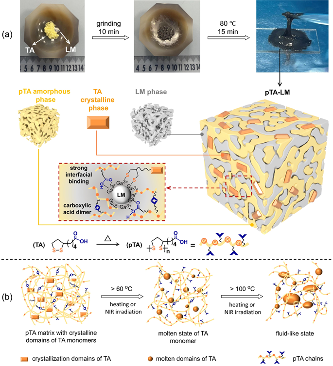 图1.(a)pTA-LM热熔粘合剂的制备以及双相分离和界面粘合的示意图。(b)pTA-LM-70%在加热或NIR辐照过程中的结构转变。