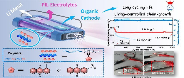 为拓展柔性器件应用,该团队开发了一类原位聚合的聚离子液体(PIL)固态电解质:由VBImTFSI与HFBMA共聚而成,兼具高离子电导率和低界面阻抗(138 Ω),且与PIC-2AQ100正极/锂负极形成牢固粘附。基于该电解质组装的软包全固态电池可在反复折叠、裁剪等极端机械变形下持续供能,50次循环后仍保持大于100 mAh g⁻¹,显著提高了有机锂金属电池的安全性和可穿戴场景适应性。