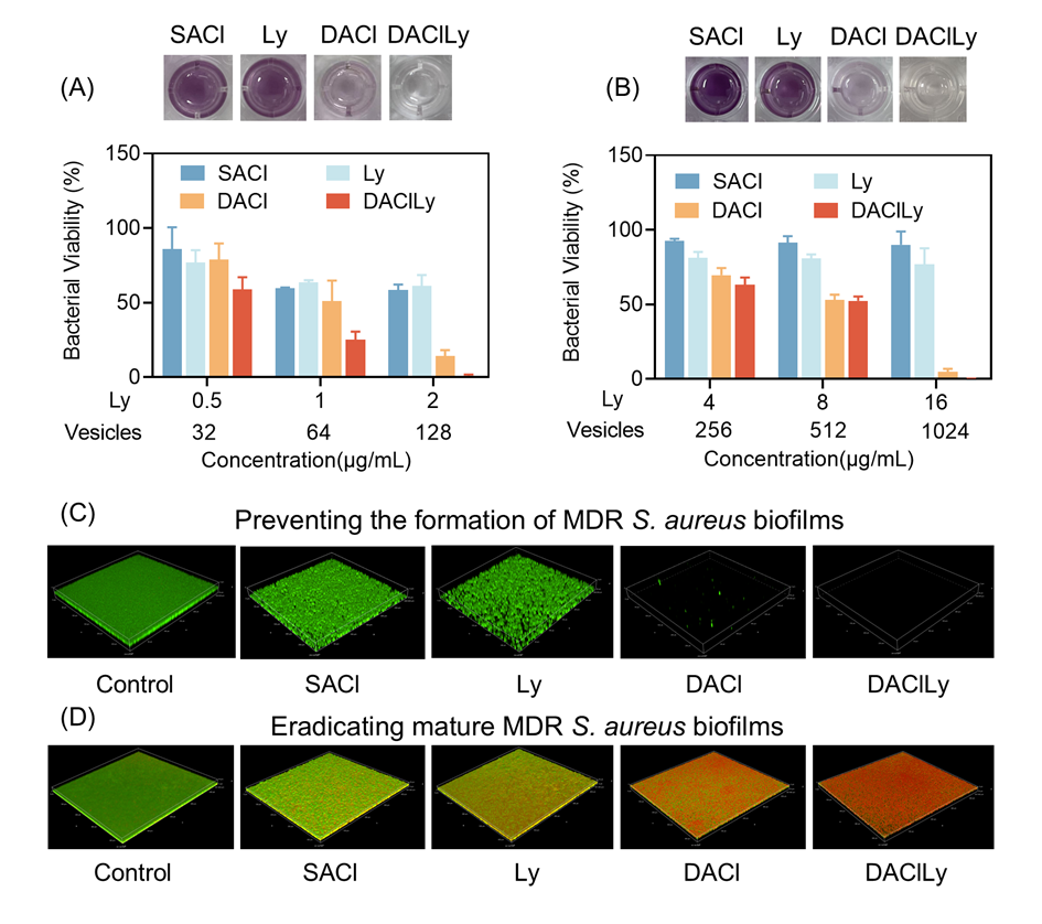实验结果表明,DAClLy纳米囊泡在体外对多种耐药金黄色葡萄球菌均表现出显著杀菌活性,且在酸性条件下其杀菌效率远高于单一组分或其他对照组。此外,这种材料不仅能预防生物膜形成,还对已形成的成熟生物膜具有强大清除能力,杀菌率超过99%,克服了传统疗法对生物膜渗透性差、效果欠佳的局限。(图2)。