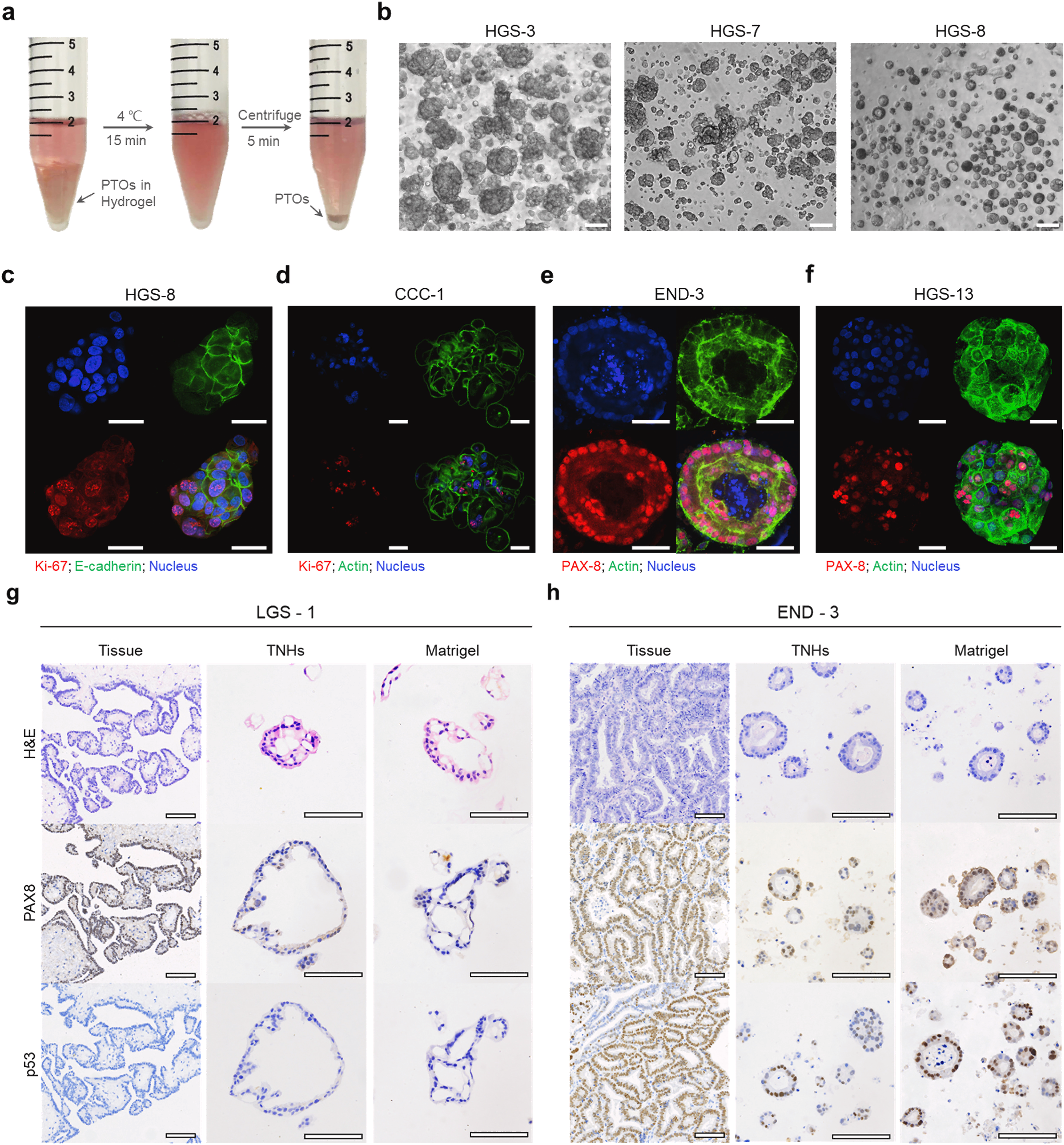 实验显示,在较低温条件下冷却后,PTOs顺利从TNHs中释放,形态与原先培养状态一致。免疫荧光结果表明,类器官表面E-cadherin表达阳性,显示其上皮来源;Ki-67阳性证明细胞保持活跃增殖;而PAX8的表达差异与患者的临床特征高度一致。进一步的组织学与免疫组化分析发现,TNHs中培养的PTOs在结构与细胞形态上均与原始肿瘤及Matrigel体系中的结果相似,保留了囊腔结构、多空泡和乳头状等典型组织特征,成功复现了肿瘤的空间异质性。(图2)
