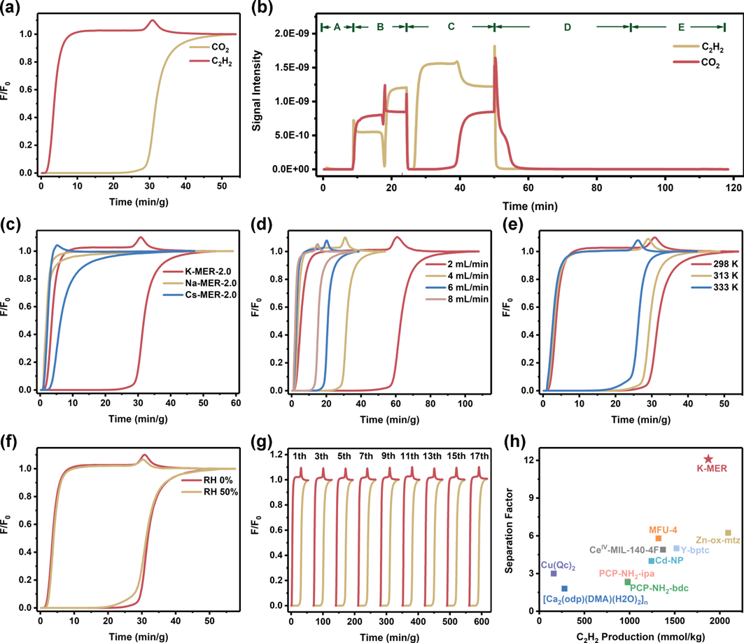 宋晓伟教授和梁志强教授课题组联合天津工业大学梅东海教授,报道了一种无需有机模板合成的柔性沸石材料K-MER-2.0(硅铝比为2.0),其在298 K和101 kPa条件下具有显著的70.9 cm3/g的CO2静态吸附容量,优于其对烃类的吸附容量(C2H2: 5.3cm3/g, C2H4: 1.3 cm3/g, C2H6: 0.6 cm3/g, C3H6: 2.7 cm3/g, C3H8:3.3 cm3/g, CH4: 0.04 cm3/g),从而展现出卓越的CO2/烃类分离性能。该材料在CO2/C2H2(体积比50/50)混合物中的理想吸附溶液理论(IAST)选择性达到了3056。值得注意的是,K-MER-2.0在穿透实验中能够一次性纯化乙炔,且纯乙炔(99.6%)产量高达1872 mmol/kg,从而无需多阶段解吸过程,并且为CO2/C2H2反分离吸附剂提供了新的基准。