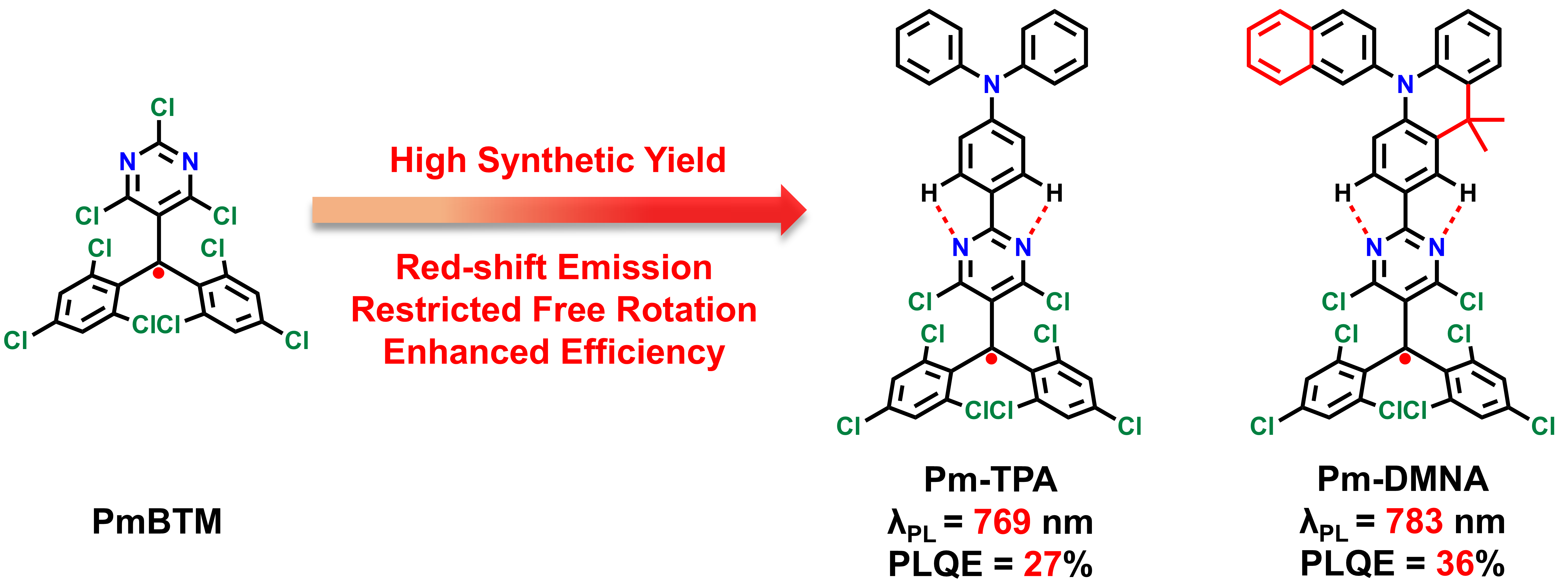 李峰团队提出了一种结合“分子内氢键”与“刚性给体”的全新设计策略:通过在经典TTM自由基骨架中首次引入嘧啶单元,使其与给体上的芳环形成分子内氢键,从而显著提升给受体的平面性;并进一步通过刚性的二甲基吖啶和大体积的萘限制给体旋转,构建高刚性、高稳定性、强电荷转移特征的NIR自由基发光体系。基于该策略,团队成功获得两种高性能自由基分子Pm-DMNA与Pm-TPA。