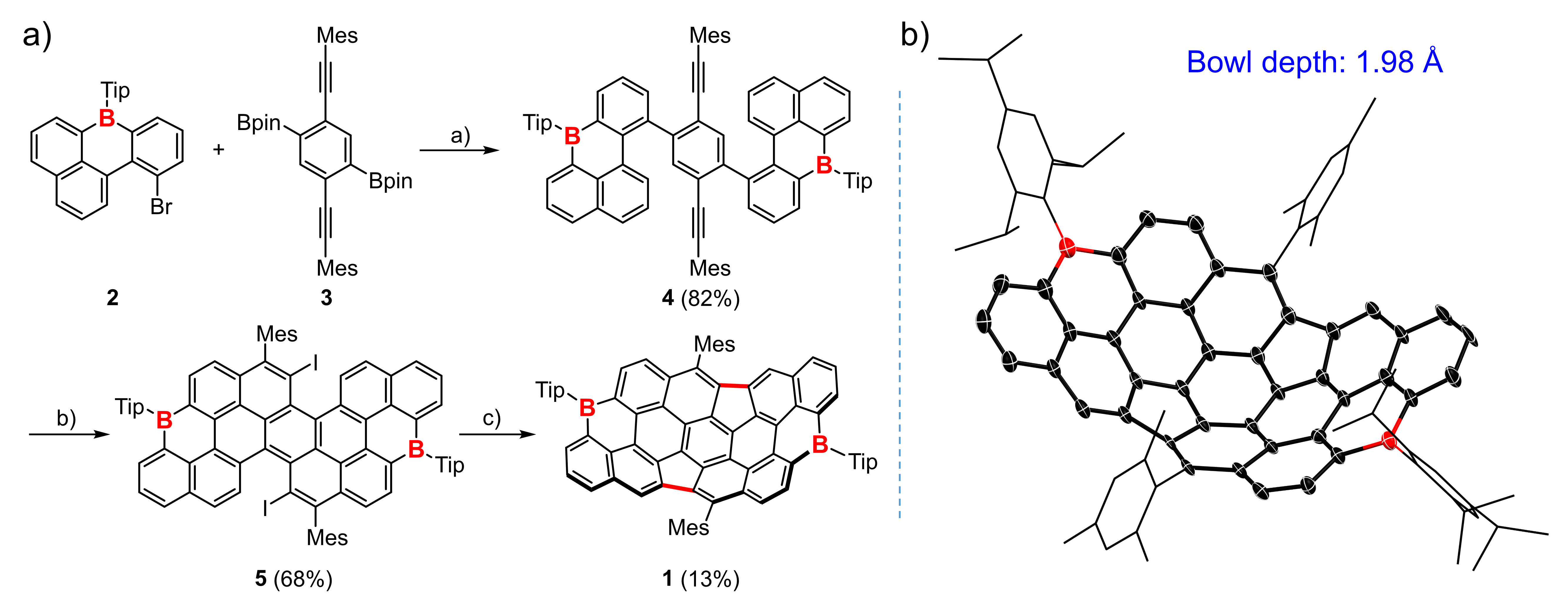 图2.碗型硼杂分子碳1的(a)合成路线和(b)单晶结构