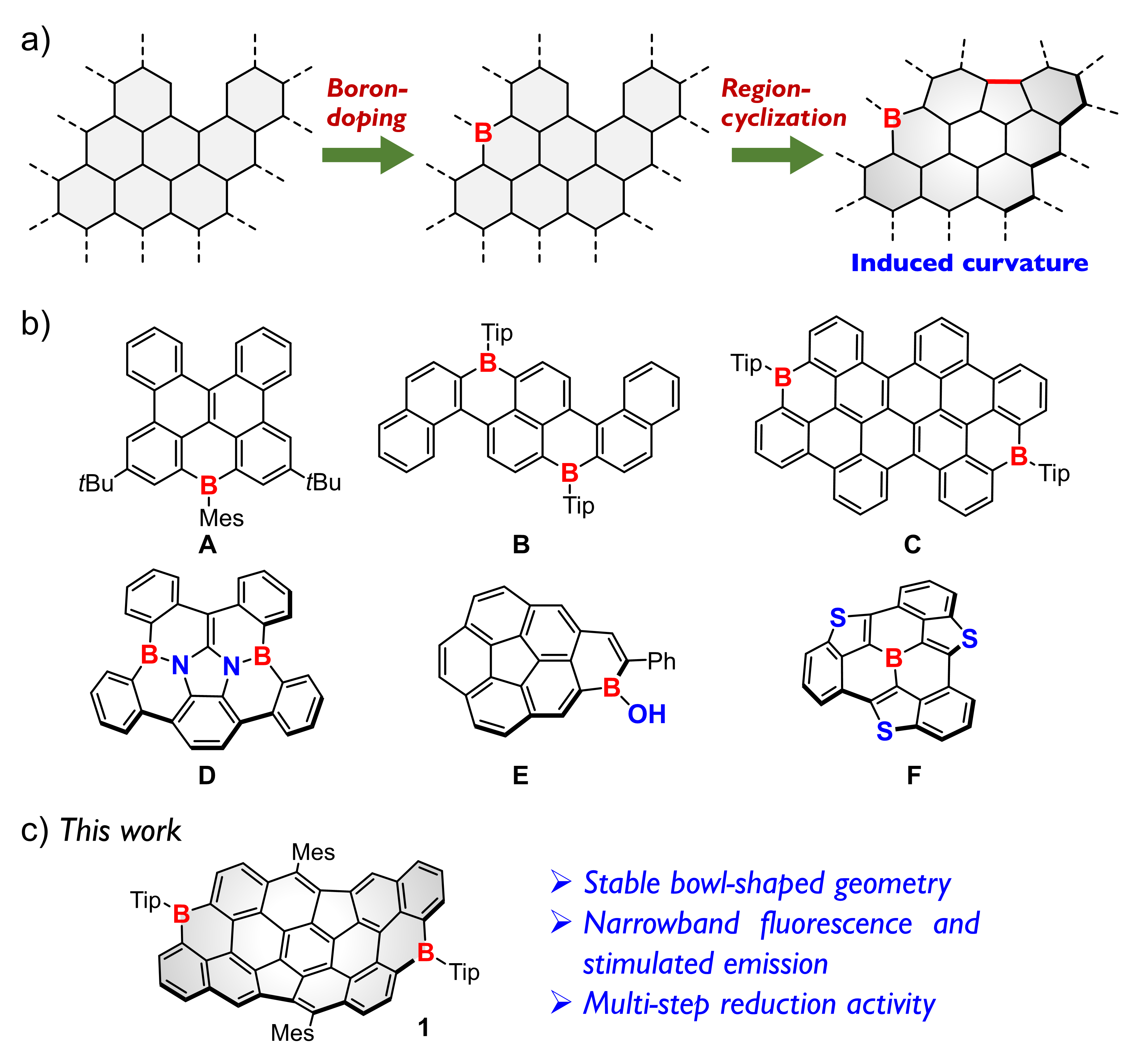 图1.(a)分子碳的硼原子掺杂和区域环化策略;(b)代表性湾边缘态的硼杂分子碳(A–C)和碗型含硼分子碳(D–F);(c)碗型硼杂分子碳1的化学结构