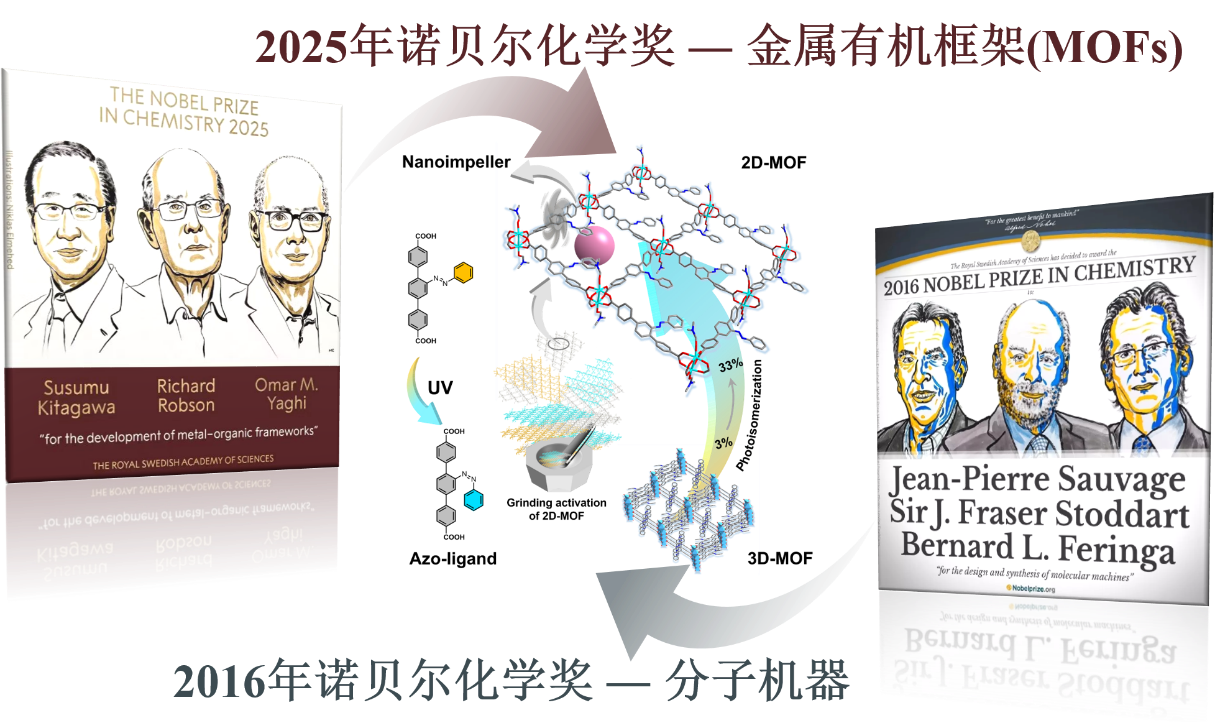图1. 2025年诺贝尔化学奖表彰MOFs的发展,2016年诺贝尔化学奖表彰分子机器的设计与合成,本研究将两者有机结合成功构建MOF基纳米叶轮