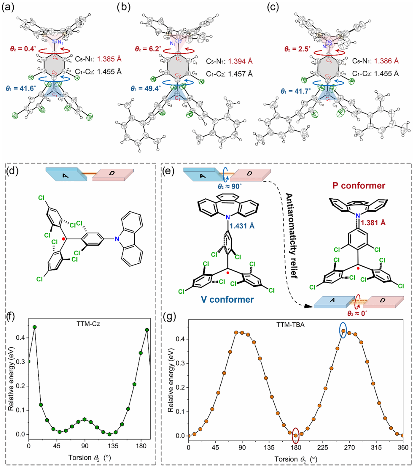 图2.a)TTM-TBA、b)M1TTM-TBA和c)和M2TTM-TBA的晶体结构;d)TTM-Cz基态下的扭曲D-A•构型和e)反芳香缓解效应诱导准平面D-A•构型的示意图;f)TTM-Cz和g)TTM-TBA基于D-A•之间扭转角变化的基态势能面