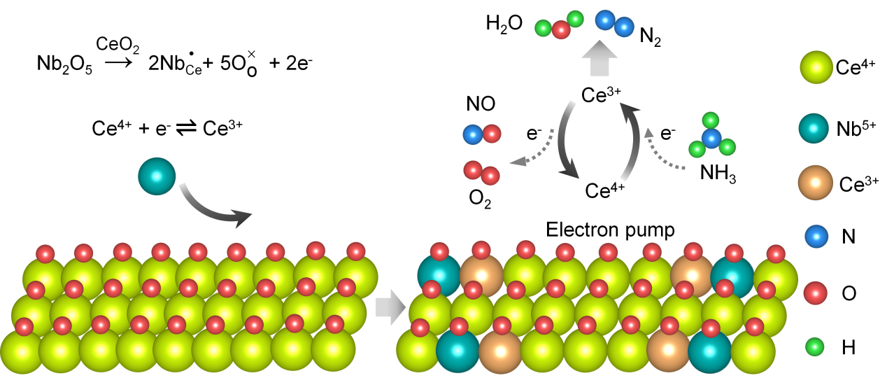 李广社教授和李莉萍教授团队以CeO2为模型氧化物,采用两步化学合成法构建了一系列电子型Nb5+掺杂CeO2催化剂。Nb5+掺杂能够在CeO2中发挥独特的“电子泵”作用,通过促进Ce3+形成并加快Ce3+/Ce4+之间的可逆循环,显著提升催化剂对反应物分子的活化能力。研究团队借助多种先进的原位表征技术,直观揭示了‘电子泵’在氧化与还原气氛下的动态作用机制。在反应过程中,Ce 4f电子直接参与了NH3-SCR反应的关键氧化还原步骤。局域于Ce3+位点的电子在热激发下参与O2活化并促进NO向硝酸盐中间体转化,同时在NH3活化过程中得到补充,从而形成高效协同的电子循环。快速电子转移显著提升了催化剂的活性、选择性与稳定性,从而实现大气污染物NOx向无害N2的高效转化。这项工作为多相催化中高性能催化剂的设计提供了新的思路。