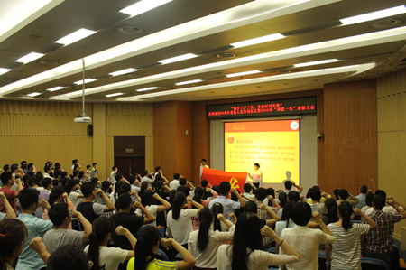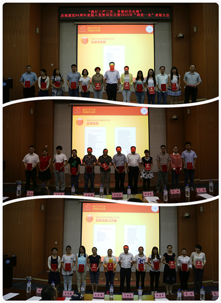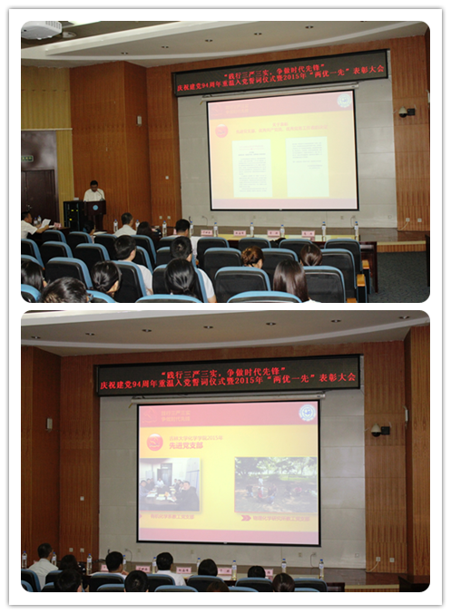 2015630日,博彩App 党委在无机超分子楼二楼圆形报告厅举行了庆祝建党94周年重温入党誓词仪式暨2015年“两优一先”表彰大会。副处级以上党员领导干部、教工党员、学生党员代表等200余人参加了大会,会议由博彩App 党委副书记李勇同志主持。
