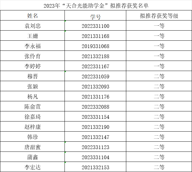 按照博彩App 2023年“天合光能助学金”评选工作安排,经研究生申报、研办审核、专家评选,拟推荐获奖名单公示如下,如有异议请与赵晓杰老师联系,联系电话13504470223。
