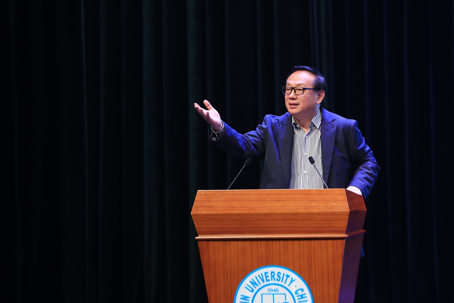 仪式结束后,江雷院士结合求学工作经历,分享了自己的教育理念作为捐赠感言,并以“创新科研选题的三个层次和八个方向”为题作学术报告。江雷提出科学研究的目的是通过科学改变生活,他引用了毛泽东提出的“自然界是不断发展的”“人类总得不断地总结经验,有所发现,有所发明,有所创造……”的科学发展思想,提出原创科研选题的三个层次,分享了“改写教科书”“领域遗留挑战”“总结普适规律”“研制先进仪器”“研发关键技术”“重视偶然发现”“应用全新理论”以及“生命启发科研”的原创科研选题的八个方向。