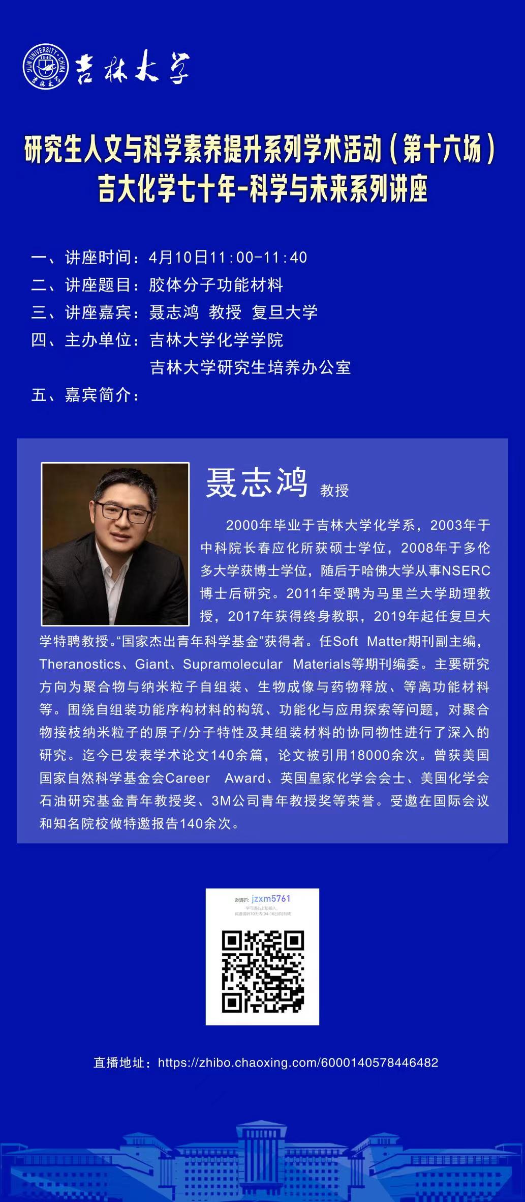 上一条:吉大化学70年院庆系列活动——科学与未来系列讲座:高分子复合非对称微结构