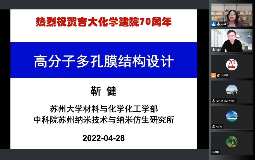 4月28日上午,苏州大学特聘教授,国家杰出青年科学基金获得者靳健应邀线上做客“吉大化学七十年——科学与未来系列讲座”,以“高分子多孔膜结构设计”为题,为博彩App