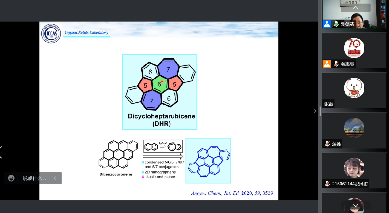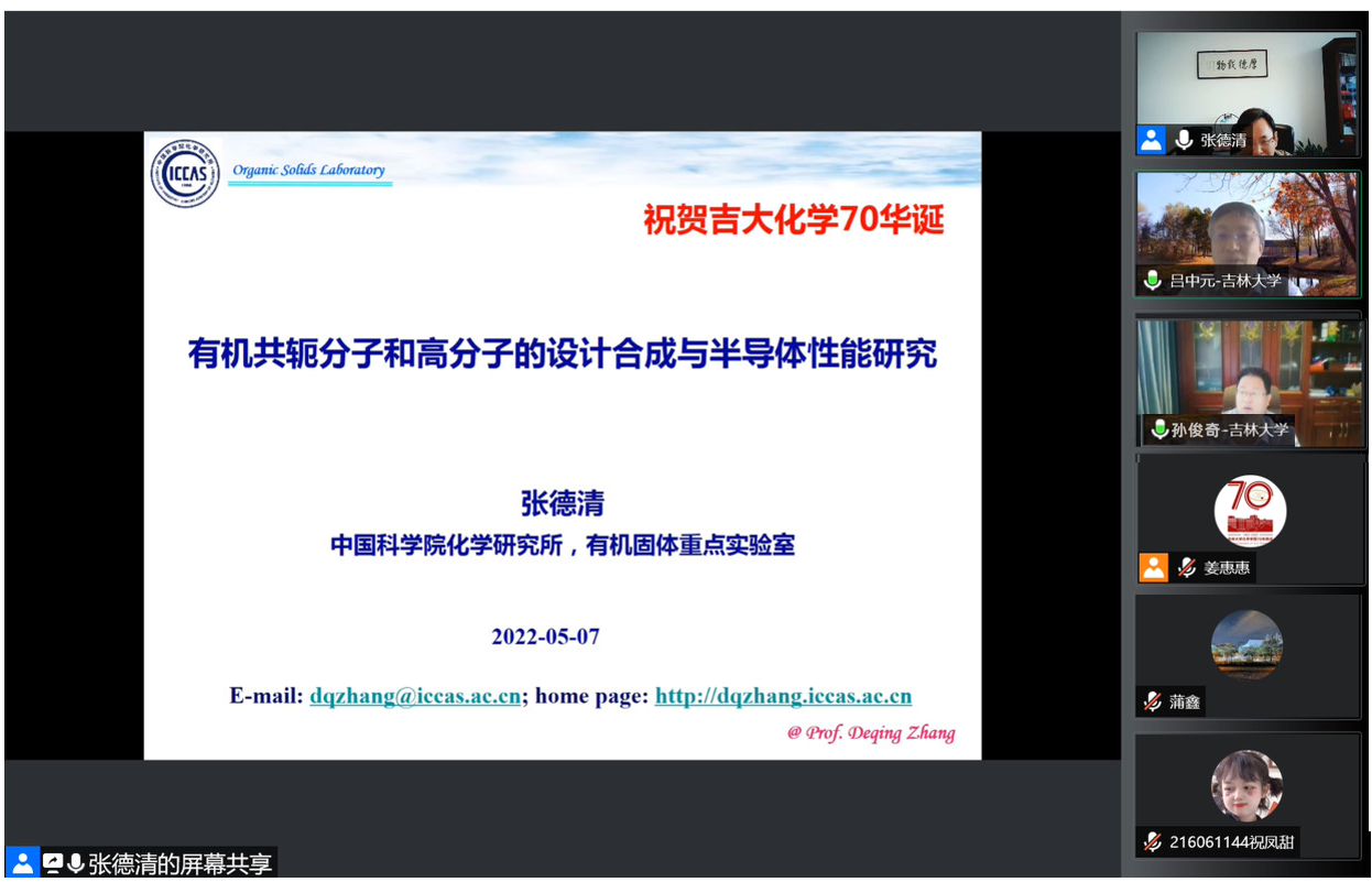 化学研究所研究员、国家杰出青年科学基金获得者张德清应邀线上做客“吉大化学七十年——科学与未来系列讲座”,以“有机共轭分子和高分子的设计合成与半导体性能研究”为题,为博彩App