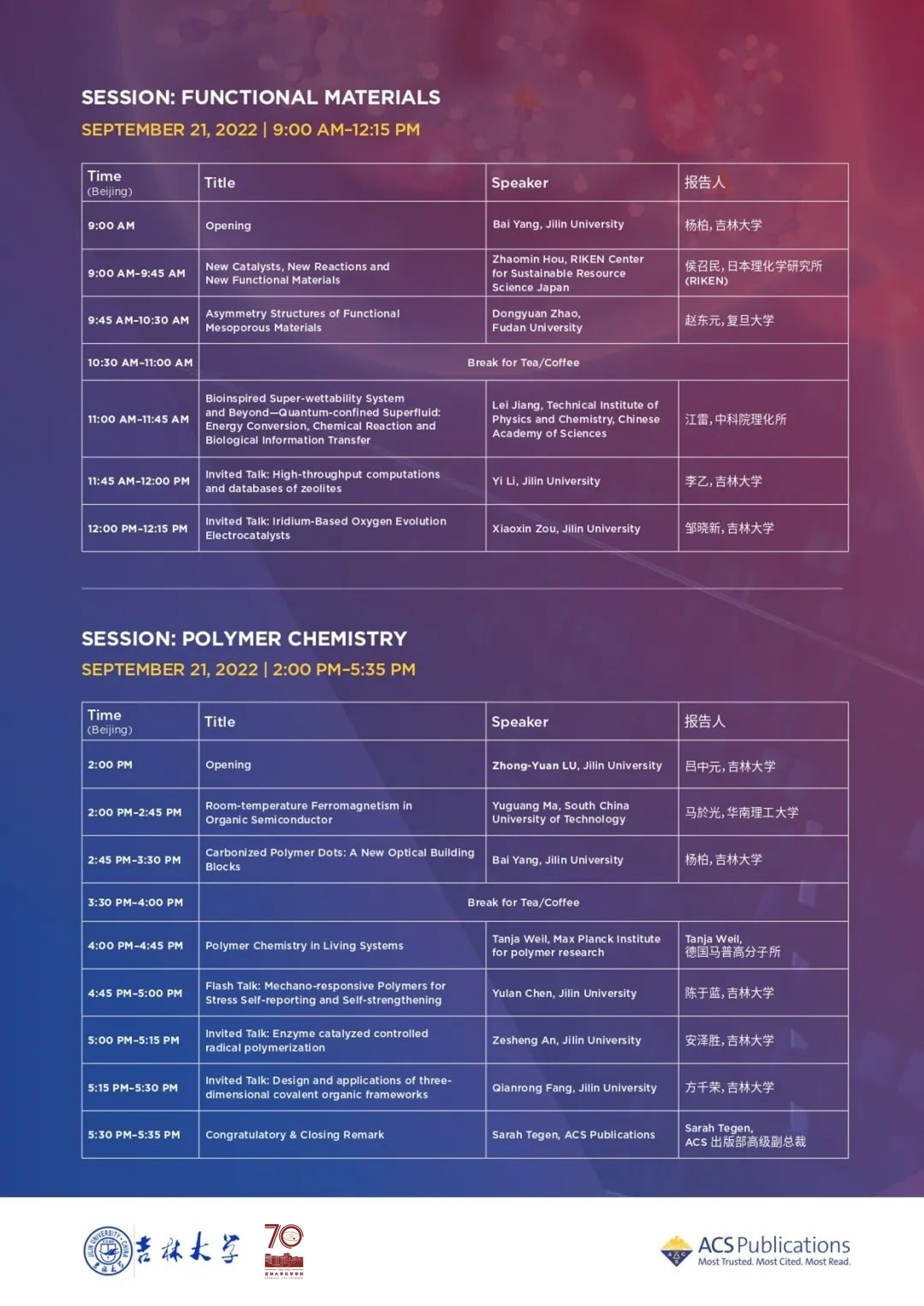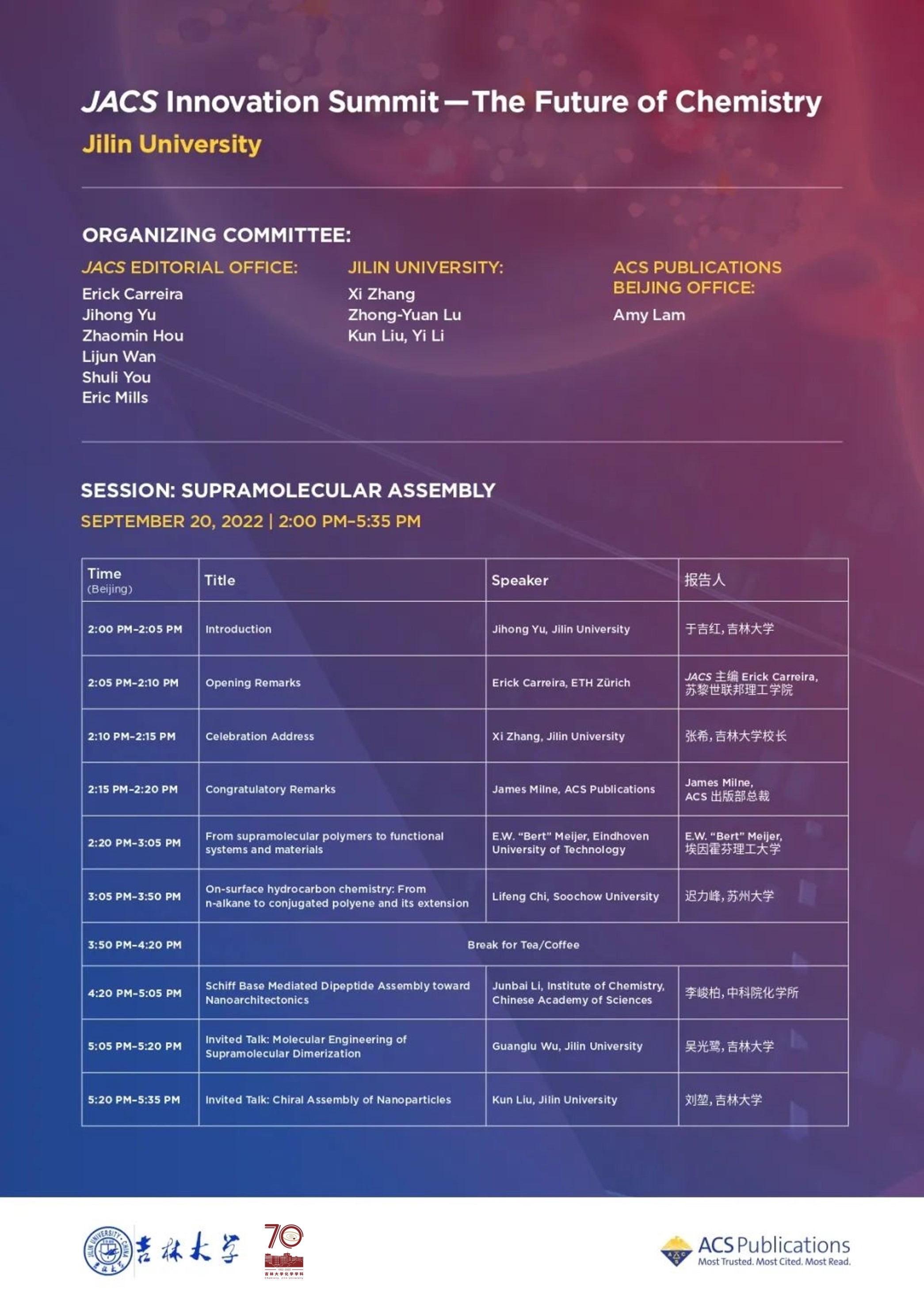 庆祝吉大化学学科创建70周年暨JACS 创新峰会,JACS Innovation Summit — The Future of Chemistry, 于北京时间9月20日14:00-17:35、9月21日9:00-17:35线上直播,欢迎关注ACS美国化学会视频号,参加讨论!