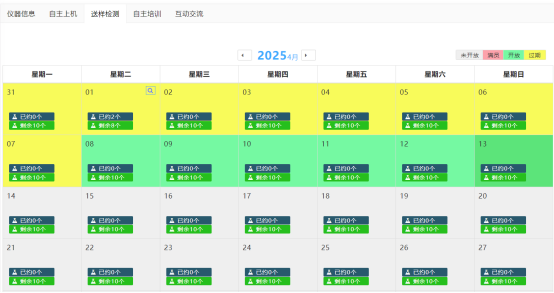 4. 根据所选择的测样方式,进入如下所示“自主上机”或“送样检测”页面。在“自主上机”页面根据仪器开放的自主上机时间,选择自主上机测试日期和时段,在“送样检测”页面选择送样预约提交日期。注意:用户可以通过步骤确定自主上机预约的具体日期和时段,但在“送样检测”页面中选择的日期只代表在选择在该日期提交送样预约,不代表一定可以在该日期进行样品测试,送样预约具体测试日期由仪器管理员根据仪器机时和送样预约提交顺序进行安排。