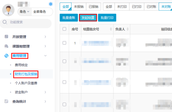 4. 进入后点击“费用管理”—“财务打包及报销”—“发起结算”。