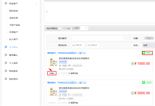 1. 用户预约的自主上机测试或送样测试完成后,仪器管理员将依据实际情况进行费用核定。仪器管理员费用核定完成后,预约人登录大仪系统的“个人中心”进行费用确认。